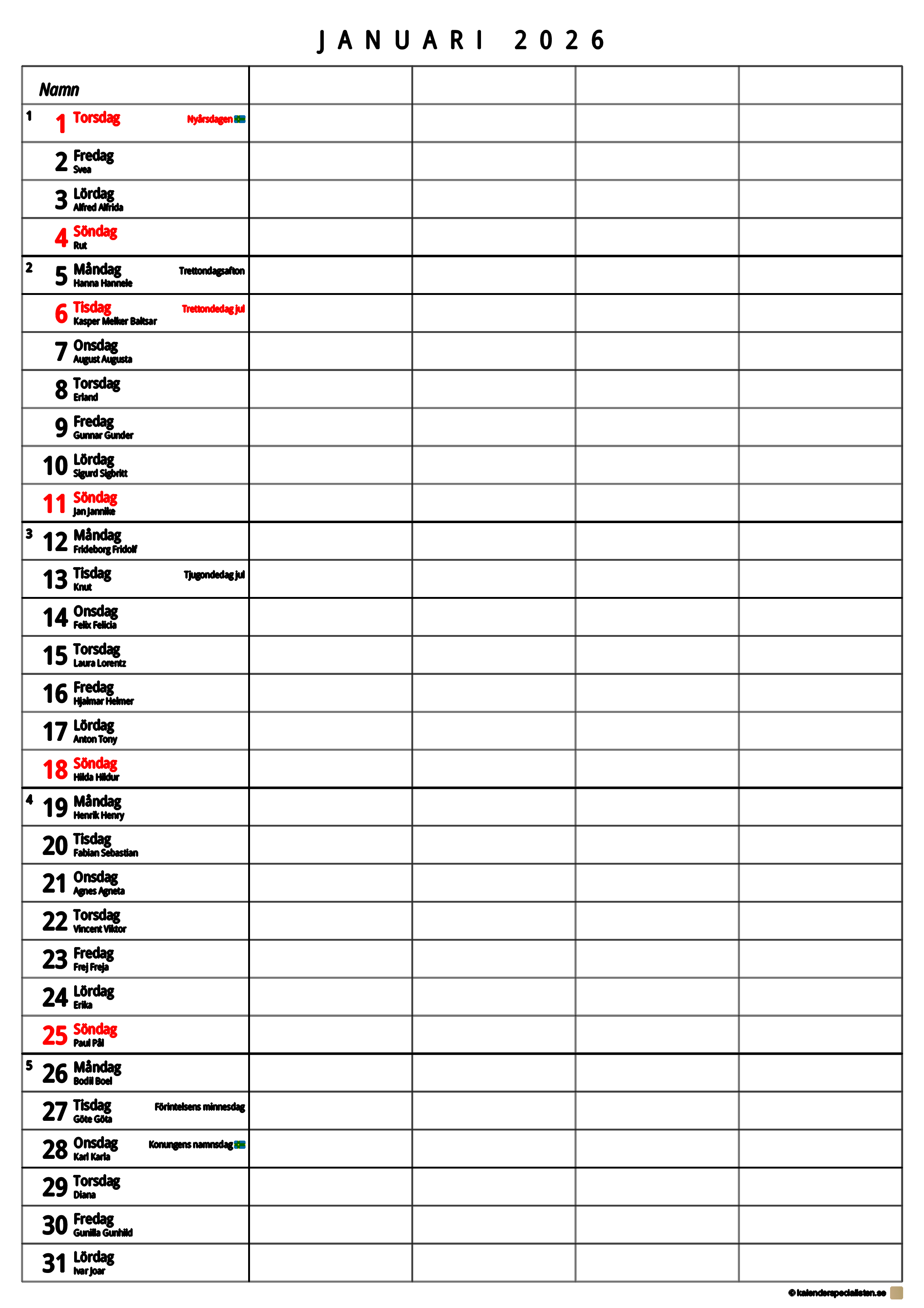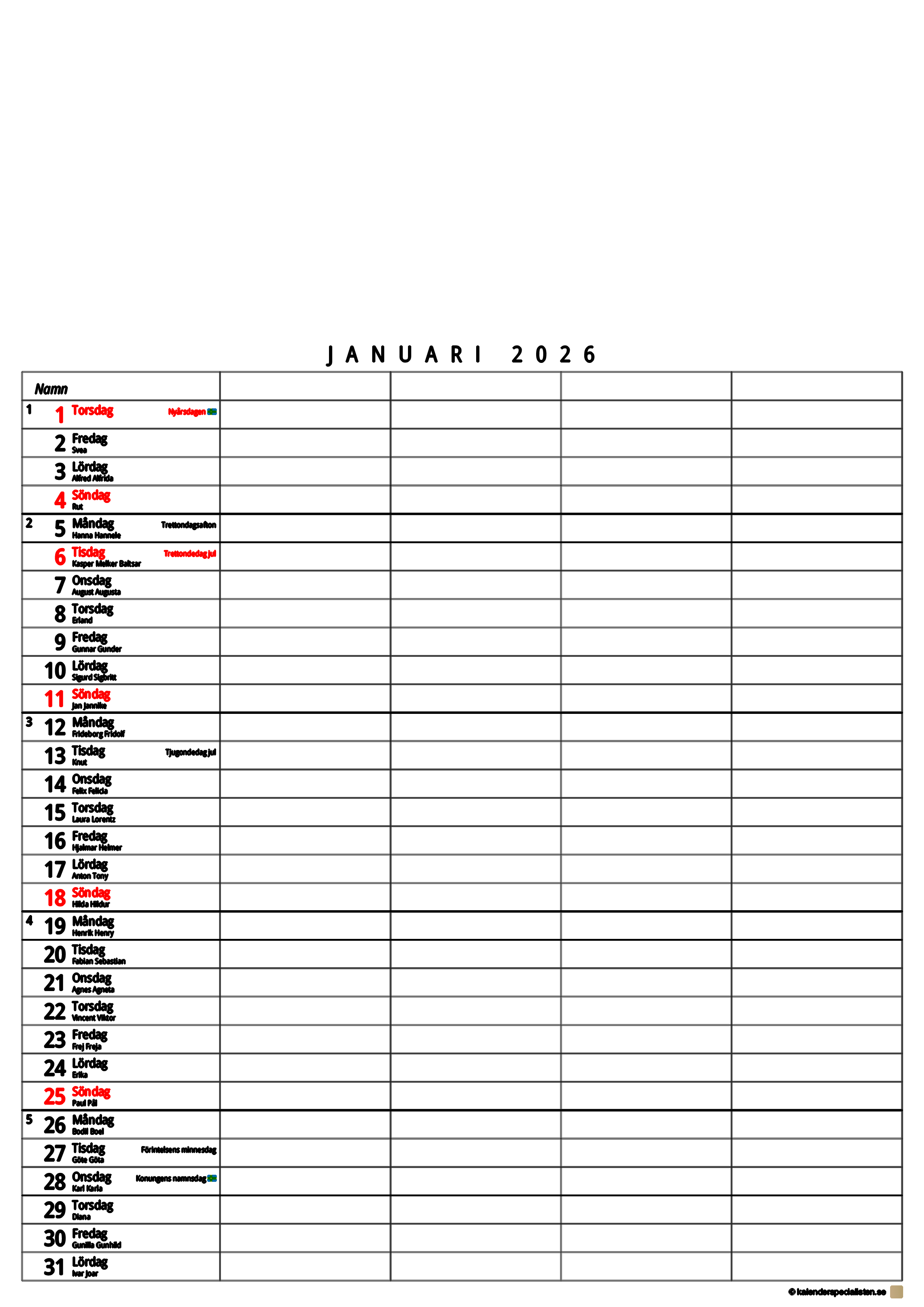 Hos oss kan du ladda ner kalender utan kostnad. Du kan i dagsläget välja mellan två typer av kalendrar: familjekalender och väggkalender. Alla kalendrar visar svenska helgdagar, veckonummer, namnsdagar och högtider. När du gjort dina val öppnas kalendern som PDF, redo för utskrift.